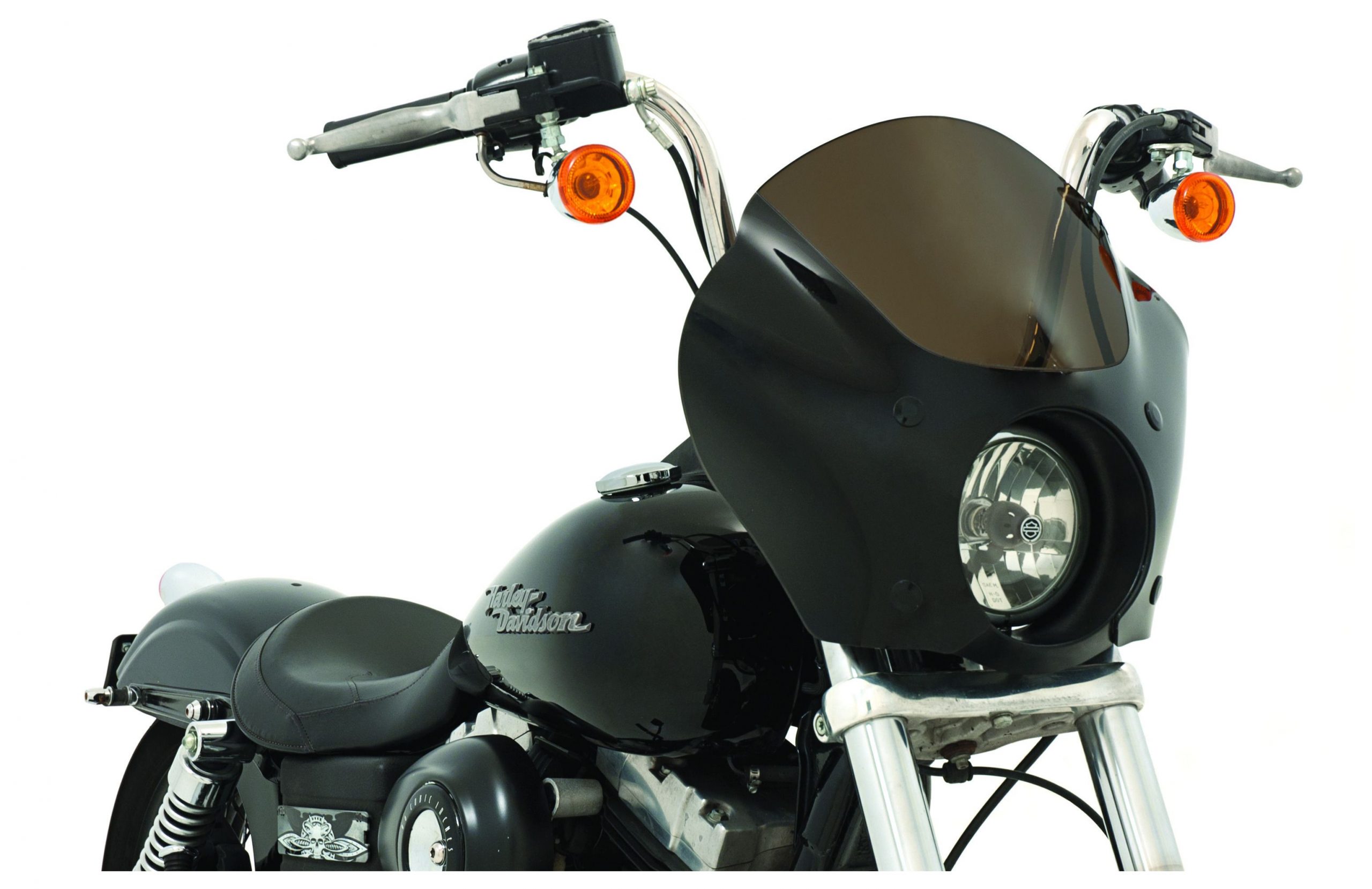 If you’re putting together a club-style bike, a bikini fairing is a necessary ingredient. Memphis Shades rolls out a timeless classic:Â The Gauntlet. Designed exclusively for Sporty and Dyna models, this fairing is proportional to the narrow forks that gives these bikes their inimitable profiles. One-piece construction makes for a good-looking, gap-free shield – they tint the upper half of the screen, and black out the inside with a Class A finish, giving a glossy appearance from the exterior that is nearly impervious to color removal. The two areas are separated with a perfectly inscribed ‘witness line’ – a totally novel approach on an old favorite.
