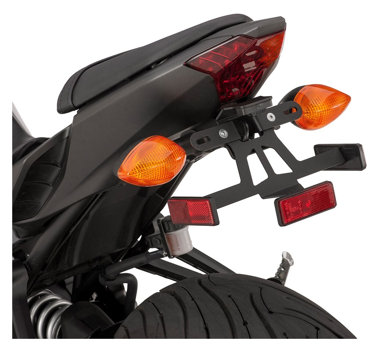 The Yamaha Fender Eliminator for the MT-07 removes the stock tag holder for a significantly smaller, lower profile LED incorporated license plate bracket that tucks closer to the tail light and retains use of the stock turn signals.